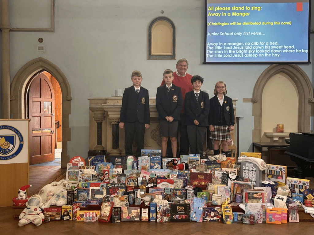Cllr Mike Goodman with school pupils and the many gifts donated. (Image: supplied)