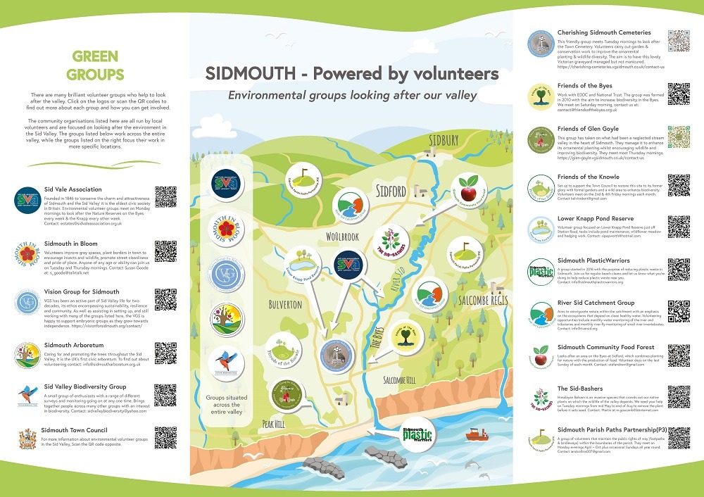 Conceived and put together by Cllr Kevin Walker, designed by Lyndsay Hooper and funded by the town council, the “SIDMOUTH – Powered by volunteers” leaflet and interactive map give very handy reference points to the green groups of the Sid Valley.