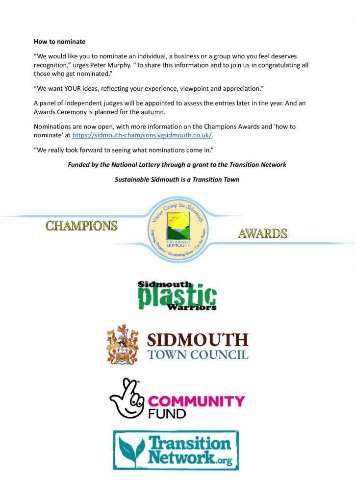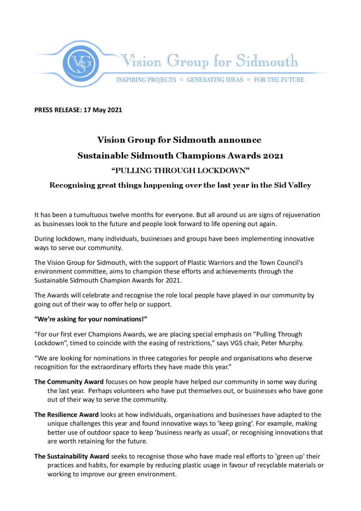 Today, the VGS launches its Sustainable Sidmouth Awards for 2021, with its partners the Sidmouth Plastic Warriors and Sidmouth Town Council’s environment committee.